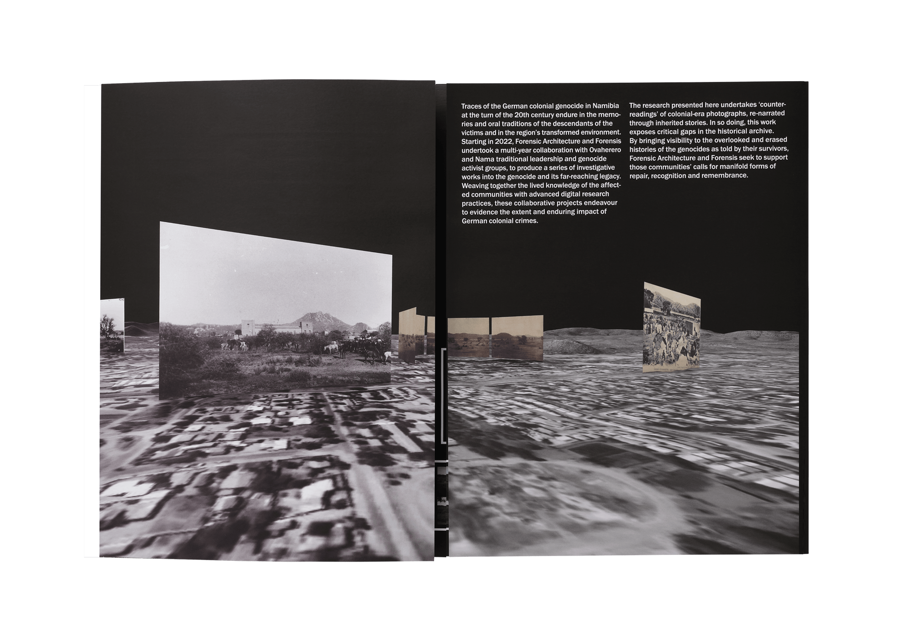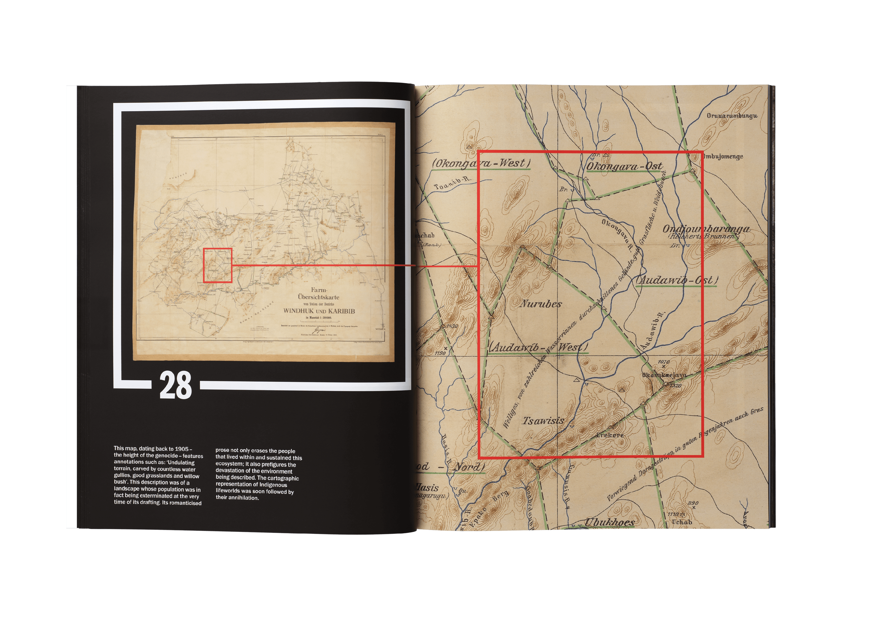 In doing so, Forensic Architecture joins historians in positioning the genocidal infrastructure developed by colonial powers in ‘German Southwest Africa’ as an antecedent to the Holocaust perpetrated by the Nazis. ‘A Counter-Archive’ invites readers into an urgently relevant discussion on the broader origins of genocide within its present-day global manifestations – namely in Palestine. It also contributes to a crucial and ongoing claim for land restitution and reparations in Namibia.